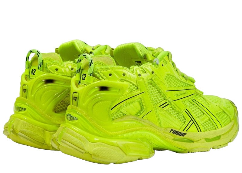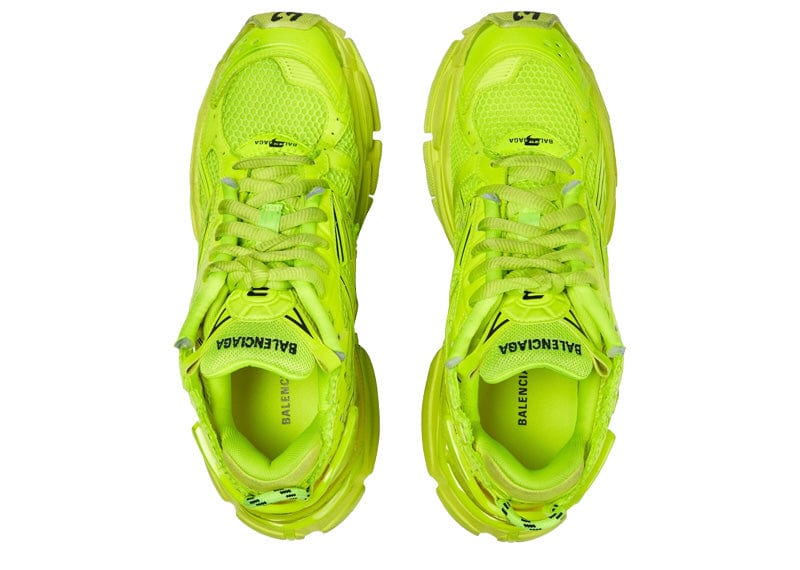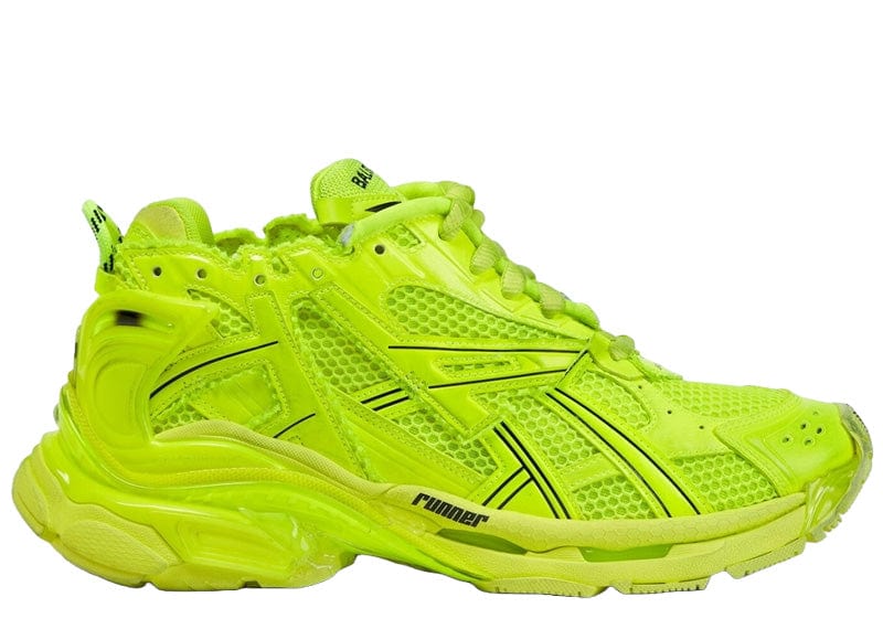 Upgrade your sneaker game with Balenciaga's Runner Fluorescent Yellow. The signature overlay design, mesh and nylon uppers provide a unique style with a worn-in look. Stand out with the bold fluorescent yellow and logo insignia details. Stay ahead of the trend with these expertly designed sneakers.