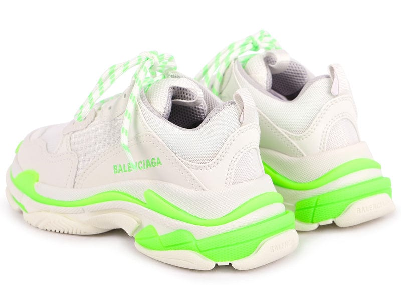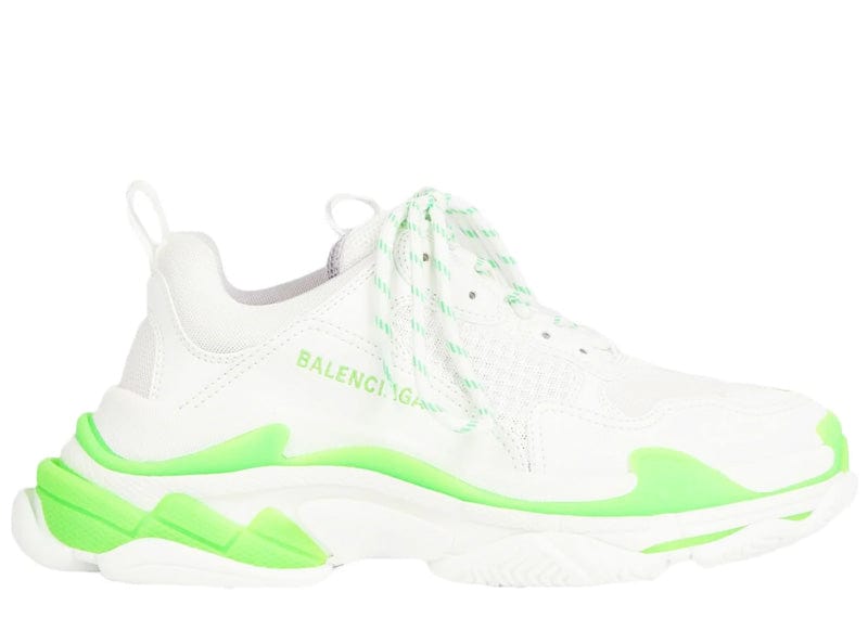 Elevate your sneaker game with Balenciaga's Triple S Fluo Green White for women. Made with quality rubber and embroidered with their iconic logo in green, these lace-up sneakers feature mesh panels and a sleek white sole. From Paris in the 19th century to now, Balenciaga remains a leader in precise and stylish designs under artistic director Demna Gvasalia.