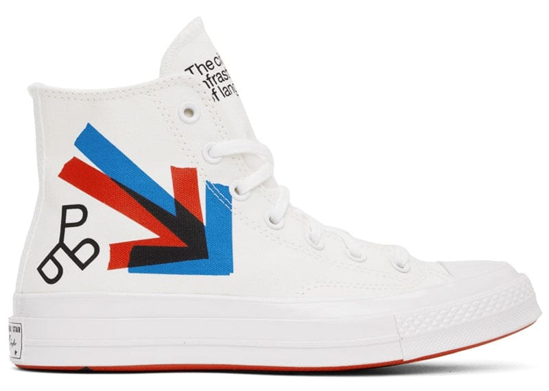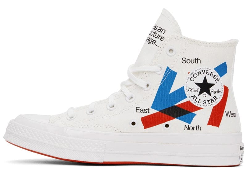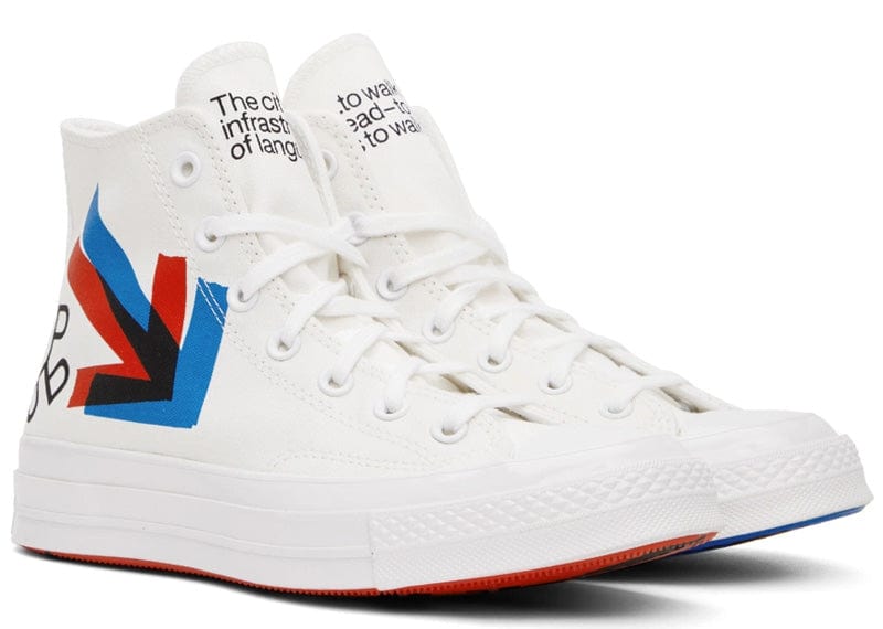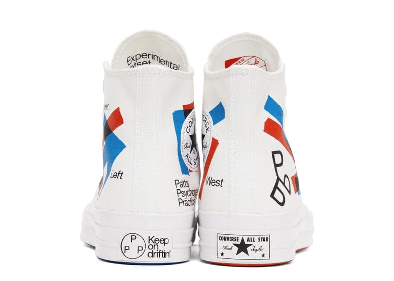 The Patta Experimental Jetset Converse Chuck Taylor All Star 70 Hi dresses the Chuck 70 in straightforward white canvas with tonal laces and white-metal eyelets. Inspired by exploring urban places, the upper displays overlapping arrow graphics in Fiery Red and Diva Blue. The left and right shoe feature different graphics and lettering on each side. For example, the right shoe’s outer side panel showcases "PPP," while the left shoe’s outer side reads "RIGHT DOWN LEFT UP."