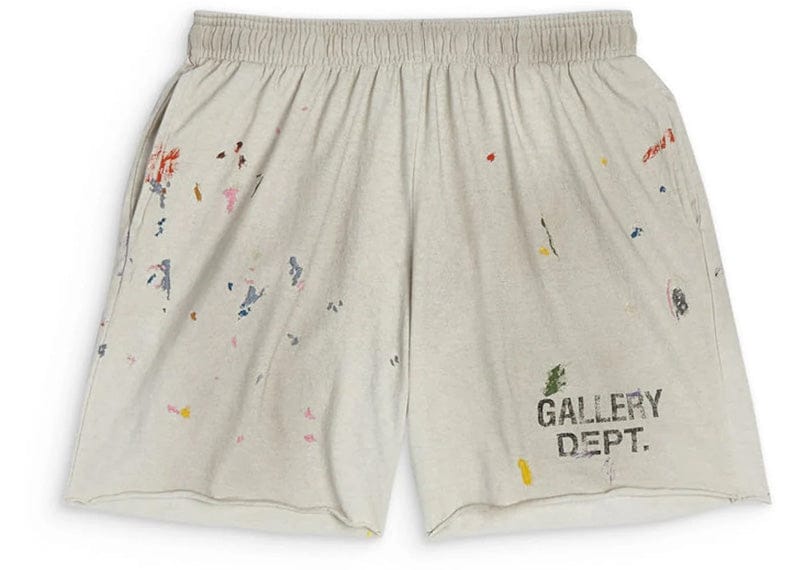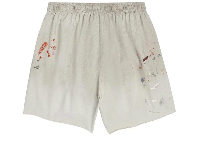 Gallery Dept. Insomnia Shorts in white showcase the label's signature aesthetic through heavyweight cotton jersey construction and artistic hand-painted splatters. The relaxed, above-the-knee silhouette features raw-edged hems, deep functional pockets, and an exposed elastic waistband with adjustable internal drawcord for personalized fit. Breathable yet durable, these shorts balance comfort with distinctive design, finished with the iconic Gallery Dept. logotype on the right leg—an essential piece for curated contemporary wardrobes.