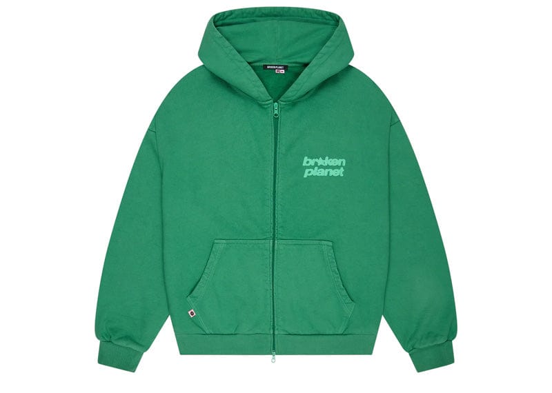 Experience unmatched comfort and durability with the Broken Planet Basic Zip-Up Hoodie in Washed Pine Green. Crafted from ultra heavy weight 540 GSM organic cotton, this hoodie features a bold puff print star logo and a unique garment-dyed finish for a soft, worn-in feel. Each piece boasts subtle rips and fading, giving it a distinct, artisanal character. Perfect for those who value style and quality, this hoodie from the exclusive Broken Planet Euro Summer collection offers a standout look that’s truly one of a kind.
