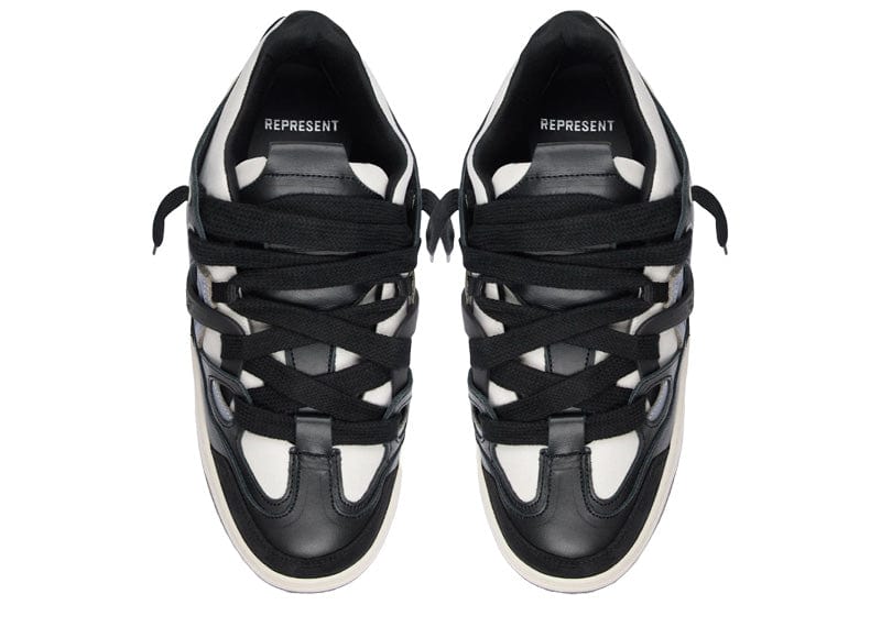 Get ready to skate in style with the Represent Bully Sneaker Black White! This retro-inspired sneaker features a ballistic nylon mesh upper with leather and suede overlays, and Represent's iconic logo on a TPU exoskeleton. A padded collar and chunky lacing add to the fierce aesthetic, while the two-tone outsole provides ultimate comfort.