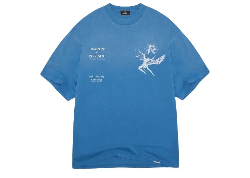 Introducing the Icarus T-Shirt in Sky Blue, a t-shirt crafted from luxury medium weight cotton, with a slightly oversized fit. It features Icarus graphic to the front and back and is finished with Represent metal bar to the hem. The wash of this t-shirt features a gradient spray for a beautifully blended colour texture.