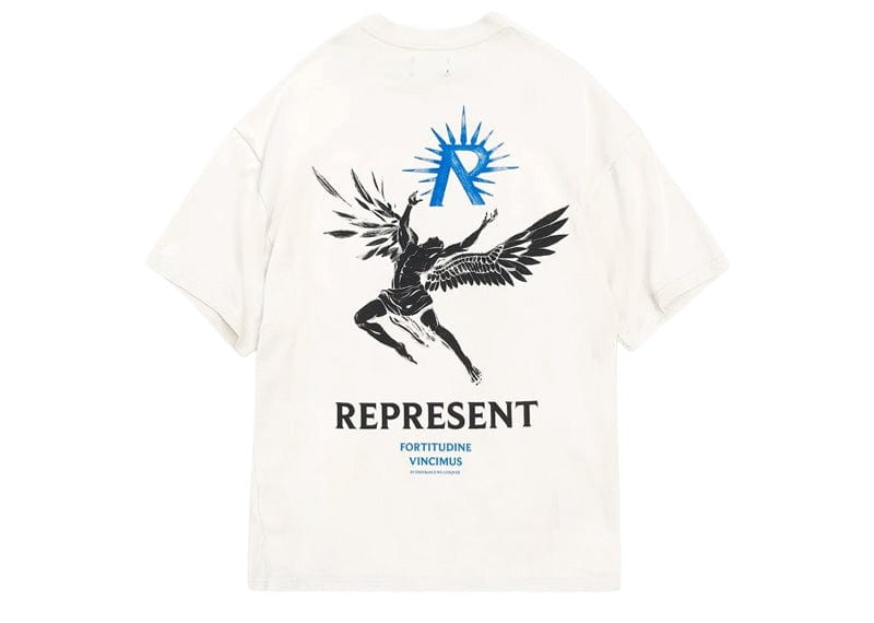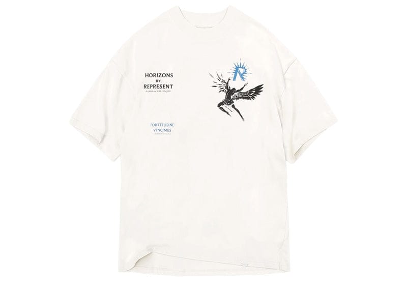 Introducing the Icarus T-Shirt in Flat White, a t-shirt crafted from luxury medium weight cotton, with a slightly oversized fit. It features Icarus graphic to the front and back and is finished with a Represent metal bar to the hem.